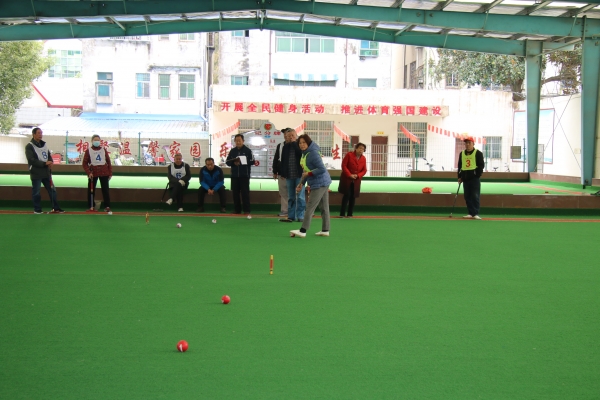 門球是在平地或草坪上用木槌擊球穿過鐵環(huán)門的一種室外球類運動。本次比賽用循環(huán)比賽的方式進(jìn)行,七支代表隊的運動員在運動中,鍛煉了體力和腦力,加深了相互間的交流。