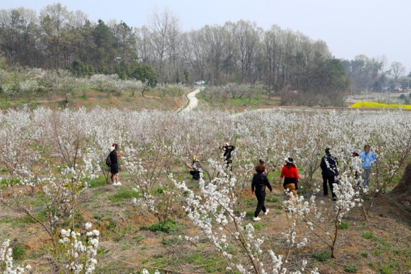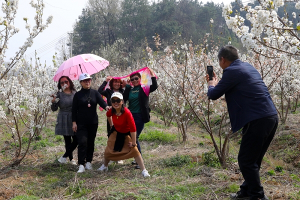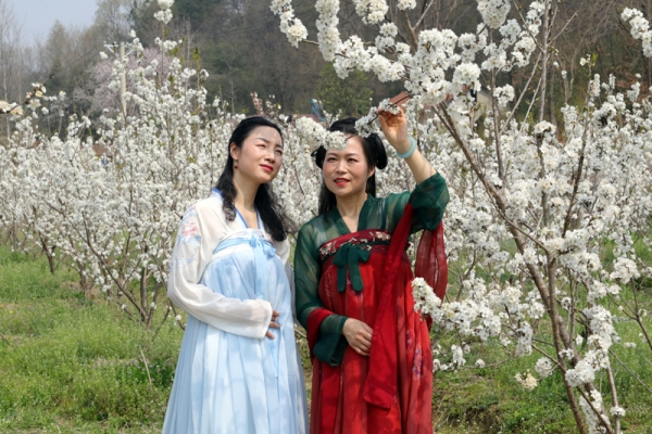 雪白的櫻桃花美不勝收,櫻桃樹(shù)下游人鮮花相映成趣。身著唐裝漢服的美女在花海里穿梭,形成一道別致的風(fēng)景。來(lái)自市老年攝影協(xié)會(huì)的攝影愛(ài)好者紛紛用手中的相機(jī)記錄下美好瞬間。不少游客們也紛紛拿起手機(jī),留下春和景明的美好時(shí)光,更有自媒體達(dá)人,對(duì)著直播鏡頭向觀眾現(xiàn)場(chǎng)推介……