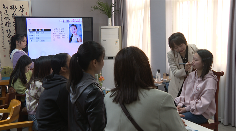 講完課件后,彩妝老師選出一名培訓學員進行實踐操作,并示范日常妝容的化妝流程、簡易的頭發(fā)編織、時尚的穿衣搭配。學員們針對自己的短板進行踴躍提問,現(xiàn)場氛圍活躍。