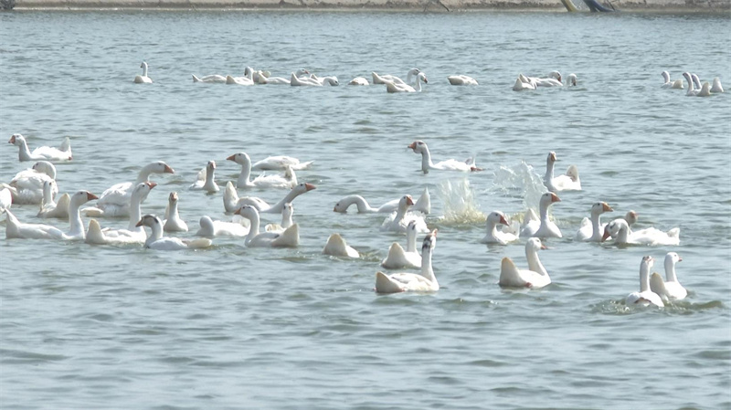 3月7日,記者走進王冬東的養(yǎng)鵝場,看到一批三花鵝正在水中嬉戲,隨著王冬東的一聲召喚,鵝群迅速上岸覓食。他養(yǎng)殖的三花鵝屬于肉用型鵝種,養(yǎng)鵝投資小,利潤高,三個月就可以出欄,看到馬上就能出欄的1500只鵝,他的臉上露出滿意的笑容。