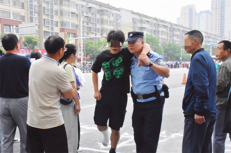 本網(wǎng)訊通訊員湯潔 杜心怡記者張尚東報道:6月8日是高考第二天,在一中考點門前,兩名輔警如期而至,將腿部骨折的考生小飛背進考場,讓他能夠順利安心的參加高考。