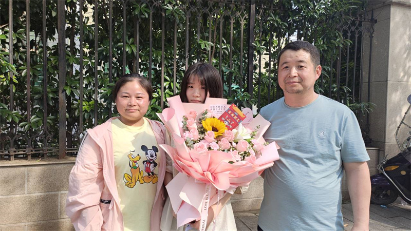 “姑娘你辛苦了!笨忌议L(zhǎng)劉銀不僅給女兒準(zhǔn)備了鮮花,也給她遞上一個(gè)“金榜題名”的紅包!跋M覀児媚锔呖纪炅,出去旅游一下放松一下心情,希望她以后健康平安就好!