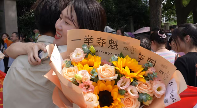 當(dāng)天下午,在宜城二中考點(diǎn)外,許多家長(zhǎng)已提前等候在大門(mén)外。他們有的手舉橫幅,有的手捧鮮花,在烈日炎炎下等待著,希望能夠第一時(shí)間和孩子相聚,為他們的辛勤付出鼓勵(lì)和慶祝。