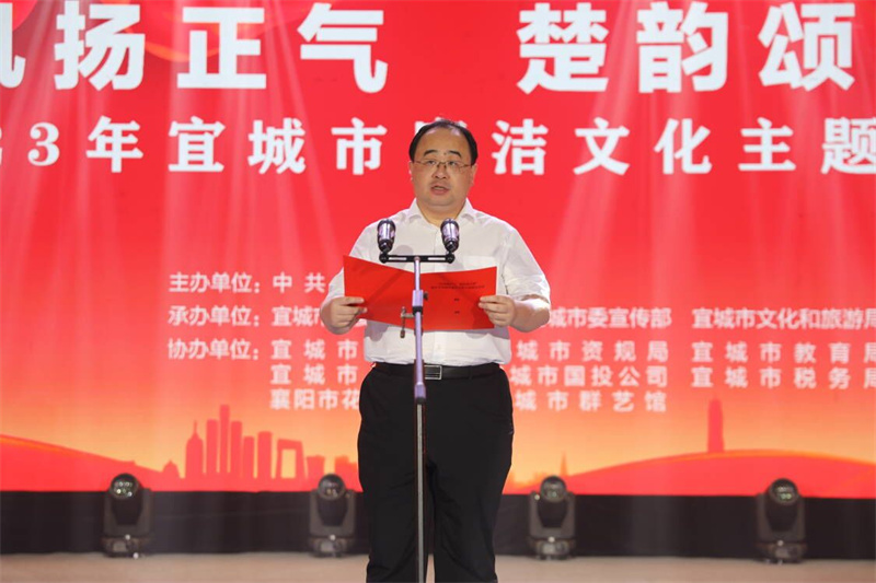 市委書記武義泉致辭。武義泉指出,近年來,市委、市政府高度重視廉潔文化建設(shè),將推進(jìn)清廉建設(shè)作為轉(zhuǎn)作風(fēng)、提能力的重要政治任務(wù),以落實(shí)黨風(fēng)廉政建設(shè)責(zé)任制為抓手,把弘揚(yáng)廉潔文化與加強(qiáng)廉政教育、下基層實(shí)踐活動(dòng)等有機(jī)結(jié)合,舉辦了清廉家風(fēng)建設(shè)等一系列活動(dòng),通過訪廉、倡廉、誦廉等形式,發(fā)揮廉潔文化在反腐倡廉中的教育、示范、熏陶和導(dǎo)向作用,引導(dǎo)廣大黨員干部在實(shí)踐中學(xué)習(xí)廉潔文化、接受廉政教育,切實(shí)增強(qiáng)廉潔從政意識(shí)和拒腐防變能力,走深走實(shí)清廉宜城建設(shè)。全市上下要嚴(yán)格按照黨中央決策部署和省、襄陽市工作要求,在加強(qiáng)黨風(fēng)廉政建設(shè)、推進(jìn)廉潔文化宣傳教育上持續(xù)用力、久久為功;要立足宜城紅色文化資源稟賦,做好傳承紅色文化和弘揚(yáng)廉潔文化的結(jié)合文章;要堅(jiān)持創(chuàng)新廉潔文化宣傳教育載體,持續(xù)提升宣傳教育實(shí)效,實(shí)現(xiàn)干部清正、政府清廉、政治清明、社會(huì)清朗,奮力譜寫清廉宜城建設(shè)新篇章!