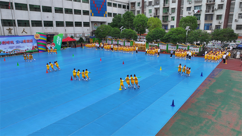 下午進(jìn)行的運(yùn)動(dòng)會(huì)項(xiàng)目《“跳”動(dòng)童年 “筋”彩飛揚(yáng)》、《胸有成“竹”節(jié)節(jié)高》、《童心跳躍 共探“繩”奇》等大型體育節(jié)目展現(xiàn)了各藝術(shù)社團(tuán)的成功。四年級(jí)的體育項(xiàng)目和五年級(jí)的團(tuán)體操充分展示了力與美的完美結(jié)合。