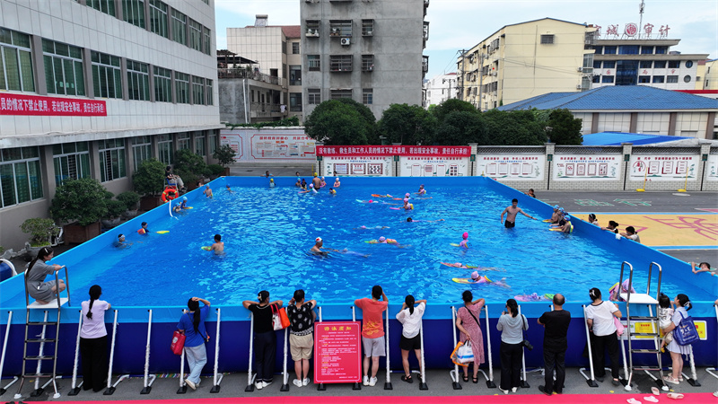 8月11日下午5點(diǎn),在實(shí)驗(yàn)小學(xué)校園內(nèi),30多名小學(xué)生身著泳衣泳帽,在專業(yè)教練的指導(dǎo)下認(rèn)真熱身,聆聽(tīng)動(dòng)作要領(lǐng)。隨后,在教練保護(hù)下,孩子們分組下水,練習(xí)憋氣、蹬腿、飄浮等基礎(chǔ)動(dòng)作。歡聲笑語(yǔ)伴隨著水花四濺,一周前剛建成的可拆卸泳池,已成為校園最熱鬧、最安全的“清涼樂(lè)園”。