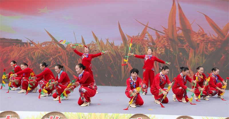 豐收節(jié)現(xiàn)場,舞蹈《踏歌起舞慶豐收》、豐收歌曲《在希望的田野上》《楚都美食香飄天下》、連響棍表演《打連響慶豐收》等節(jié)目輪番登場,謳歌時(shí)代發(fā)展,共享豐收喜悅。