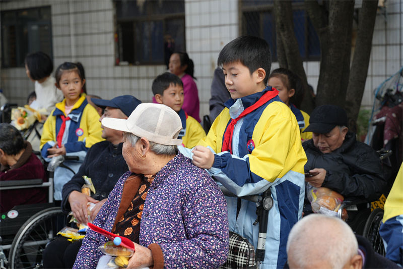 活動(dòng)中,孩子們?yōu)楦@豪先藗儙砭实奈乃嚤硌。鏗鏘有力的合唱展現(xiàn)出新時(shí)代少先隊(duì)員的蓬勃朝氣,悠揚(yáng)的排簫聲輕輕回蕩在活動(dòng)現(xiàn)場(chǎng),翩翩舞姿傳遞著對(duì)長(zhǎng)輩的敬愛之情,一幅“福壽綿長(zhǎng)”的書法作品更承載著孩子們對(duì)老人們的美好祝愿。此外,學(xué)生們還圍坐在老人身邊,聆聽他們講述往昔歲月,在跨越時(shí)空的交流中感受歷史的厚重與生活的變遷。