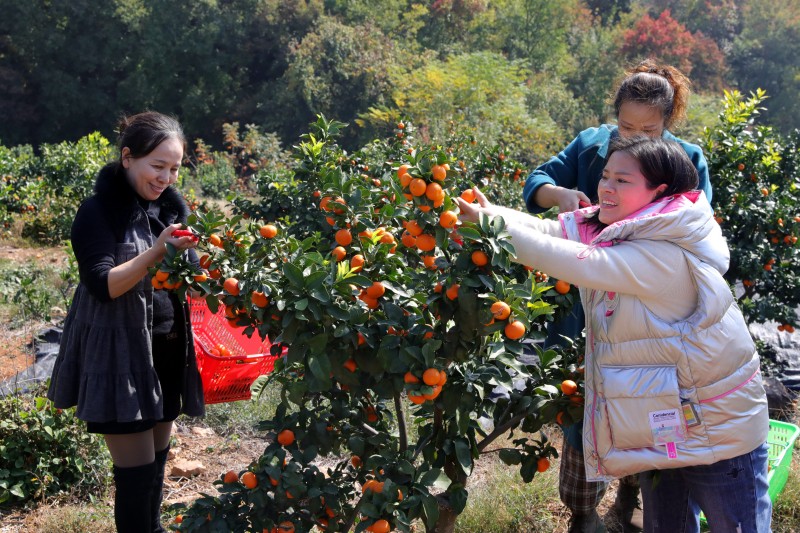 11月16日,在楊棚村種植大戶(hù)桂祖林的果園內(nèi),多名工人正在采摘成熟的砂糖桔,一片繁忙的豐收景象。