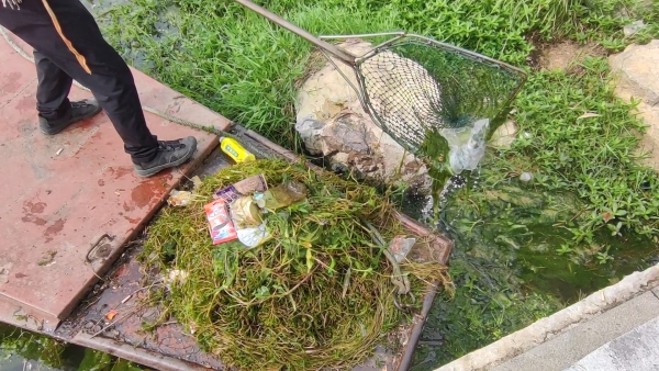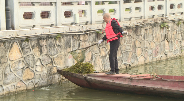 清理過(guò)程中,工作人員一人在船頭調(diào)整方向和速度,一人在船尾拿著自制的長(zhǎng)桿、撓鉤等工具,對(duì)水面上的紙盒、煙頭和礦泉水瓶等漂浮垃圾進(jìn)行打撈,并將清理的垃圾清運(yùn)至岸邊,再用垃圾車(chē)運(yùn)走進(jìn)行統(tǒng)一處理。