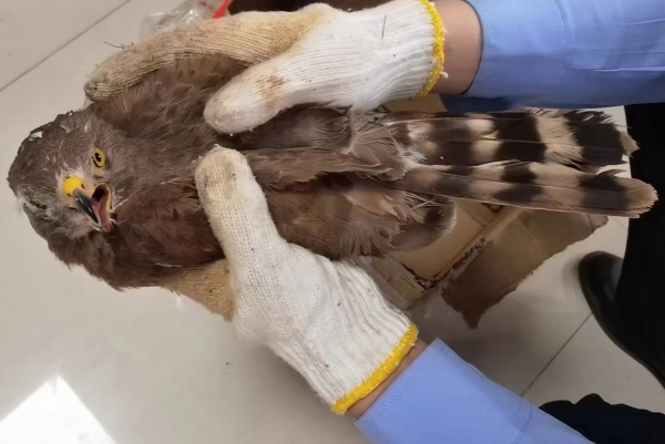 宜城市公安局王集派出所民警迅速趕到現(xiàn)場(chǎng),暫時(shí)帶回派出所照料,查看鷹隼傷勢(shì),并于5月9日將其轉(zhuǎn)至襄陽野生動(dòng)物世界觀察治療。