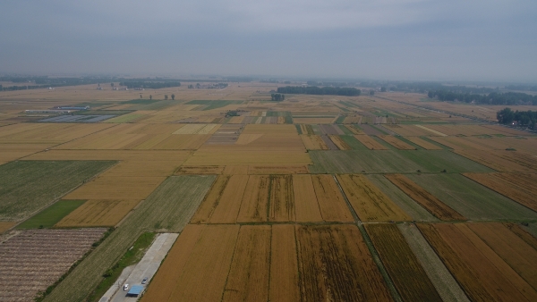 5月16日,在鄭集鎮(zhèn)王洲村,金黃的麥田一望無際,旁邊的空地上整齊地停放著近百輛收割機,為3天后周邊6個村莊近3萬畝小麥收割做好準備。