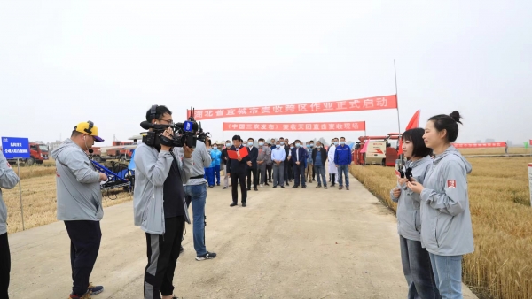 把宜城夏收作為第一站采訪的央視綜合頻道記者許偉,看到井然有序的跨區(qū)收割專業(yè)場(chǎng)面,欣然接受了采訪。