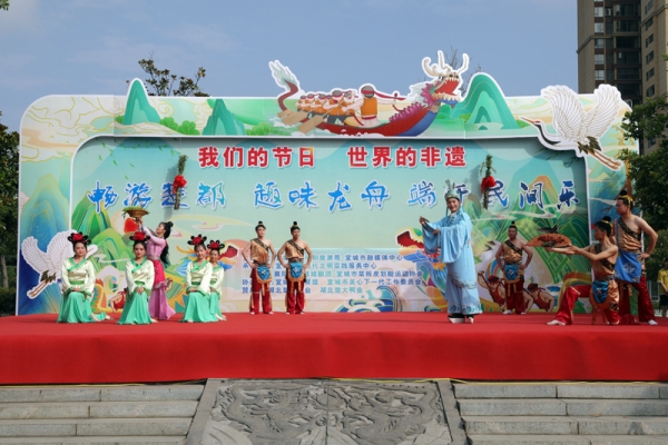 當(dāng)天上午還舉行了“端午思’屈子‘ 宋玉寄深情”活動,由襄陽花鼓劇團(tuán)現(xiàn)場表演了花鼓戲小段《宋玉傳奇》之鄀鄉(xiāng)選美、二胡齊奏賽馬、詩歌朗誦《屈原頌——生死交響》、宋玉詠唱《楚都龍舟寄深情》;六支代表隊(duì)還開展了 200米龍舟拔河、槳板抓鴨趣味賽,將深厚悠長的楚文化和中華傳統(tǒng)龍舟文化完美結(jié)合,為龍舟大賽增添了又一道風(fēng)景線。