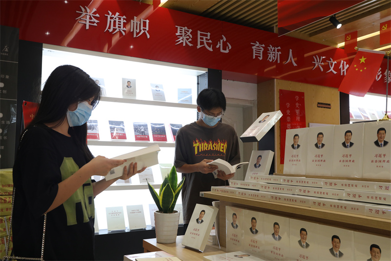 7月12日,記者在市新華書店黨建書房看到,展臺最醒目的位置便是《習(xí)近平談治國理政》圖書專區(qū),圖書一摞摞碼放整齊,已有不少讀者正在認(rèn)真翻閱、選購。