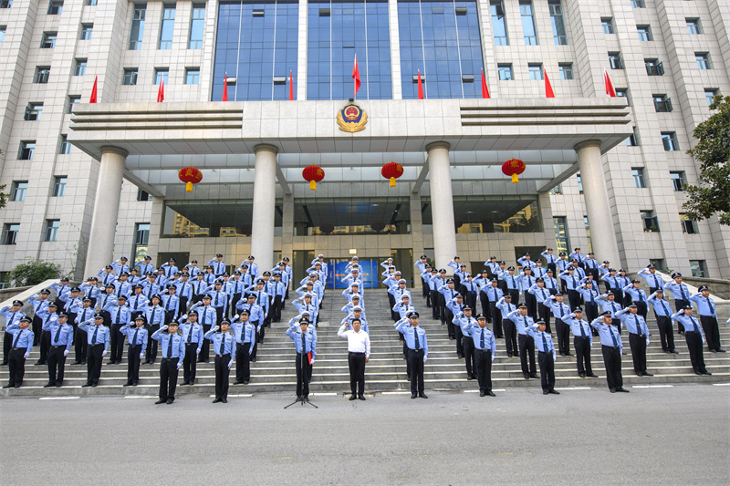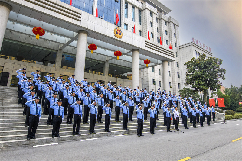升旗儀式結(jié)束后,全體民輔警鄭重宣誓:“對黨忠誠、服務(wù)人民、執(zhí)法公正、紀(jì)律嚴(yán)明,全力捍衛(wèi)政治安全、維護(hù)社會安定、保障人民安寧、守護(hù)宜城平安,堅(jiān)決打贏黨的二十大安保維穩(wěn)攻堅(jiān)戰(zhàn)!”誓言字字鏗鏘,句句擲地有聲,整個(gè)升旗儀式氣氛莊重。