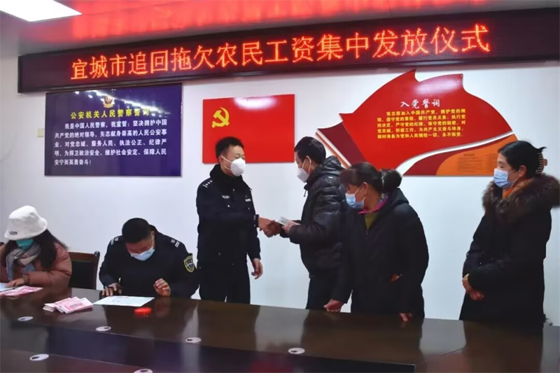 倡導(dǎo)合法討薪,涵養(yǎng)法治新風(fēng)。宜城某食品加工廠惡意欠薪,拖欠工人工錢,19名工人屢次討薪未果,宜城市公安機關(guān)獲悉情況后立即展開偵查,迅速將涉案人員抓獲歸案并依法采取刑事強制措施。今年1月,工廠所在區(qū)域派出所民警和勞動監(jiān)察部門工作人員一起,將8萬余元欠薪如數(shù)返還工人。