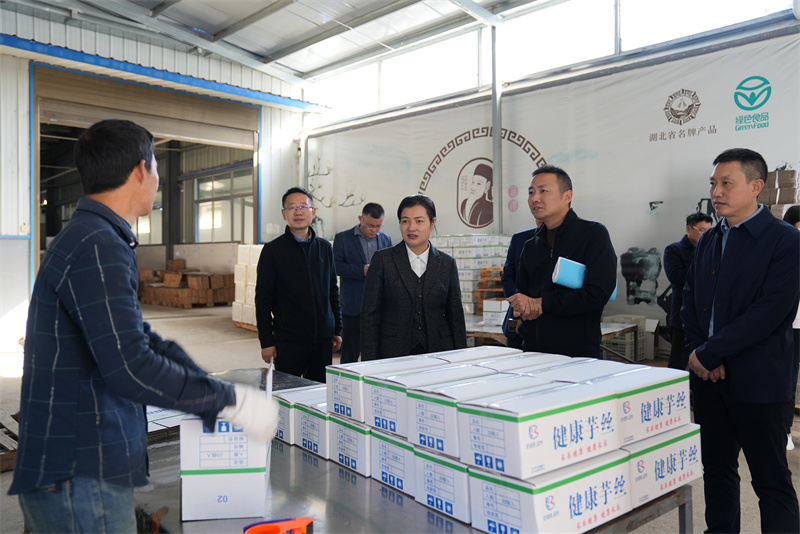 在湖北葛百歲葛業(yè)有限公司,生產(chǎn)車間內(nèi)一片繁忙情景,工人們正忙著生產(chǎn)、打包,準備將貨物發(fā)往外地。肖平一行與企業(yè)負責人交談,詳細了解產(chǎn)品生產(chǎn)經(jīng)營情況以及工人工資待遇情況。肖平指出,產(chǎn)業(yè)振興是鄉(xiāng)村振興的重中之重,要立足當?shù)刭Y源,關注市場需求,發(fā)展優(yōu)勢產(chǎn)業(yè)。她希望企業(yè)加大創(chuàng)新力度,做大做強葛根產(chǎn)業(yè),帶動更多群眾發(fā)展致富。