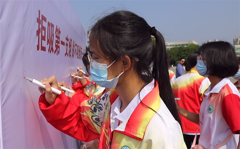 在"拒吸第一支煙,做不吸煙新一代"簽名環(huán)節(jié),宜城二中學(xué)生代表先后在拒煙板上簽名,承諾拒吸第一支煙,爭做宣傳戒煙的文明使者。