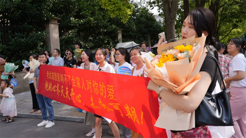 家住板橋店鎮(zhèn)的姚雨欣大中午頂著烈日趕來(lái),舉著“考試成績(jī)影響不了全家人對(duì)你的愛(ài),祝姚心齊天天開(kāi)心,未來(lái)可期!”的橫幅,期望能給結(jié)束考試的弟弟帶來(lái)安慰。