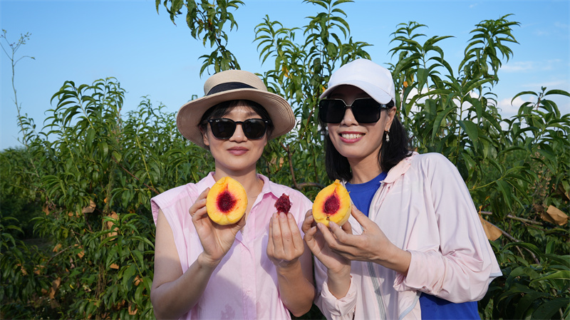 "聽說王臺(tái)村一組的黃桃特別好吃,今天我們特意驅(qū)車過來來到這個(gè)桃園。"游客丁玉敏說,"這個(gè)黃桃真大,外面黃黃的里面呢是紅紅的,第一次吃這么好吃的桃子。"