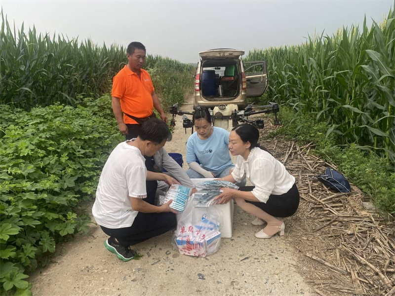 宜城市農(nóng)技推廣中心技術(shù)人員在田間放置赤眼蜂殺蟲卡,然后組織無人機(jī)作業(yè),開展生物藥劑防治。