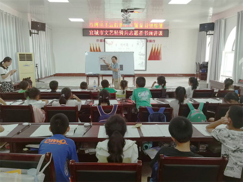 “首先我們學(xué)習寫點,同學(xué)們試著在紙上寫一下老師看看……”“大家知道中國最出名的幾位畫家是誰嗎?”活動現(xiàn)場,文藝志愿者正在詳細講解著如何握毛筆、寫字筆畫及繪畫的基本知識等,隨后又為孩子們親手示范毛筆字的書寫方法以及繪畫的順序。