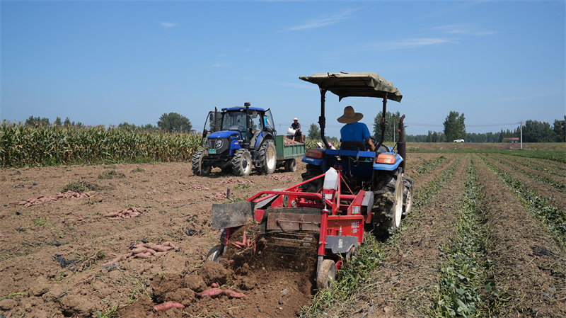8月4日,在南營(yíng)街道萬(wàn)楊村蔬菜種植基地,一臺(tái)拖拉機(jī)正拉著紅薯收獲機(jī)在紅薯地里來(lái)回穿梭,隨著紅薯收獲機(jī)掀土、抖動(dòng),一個(gè)個(gè)飽滿的紅薯破土而出,落在了隴上。