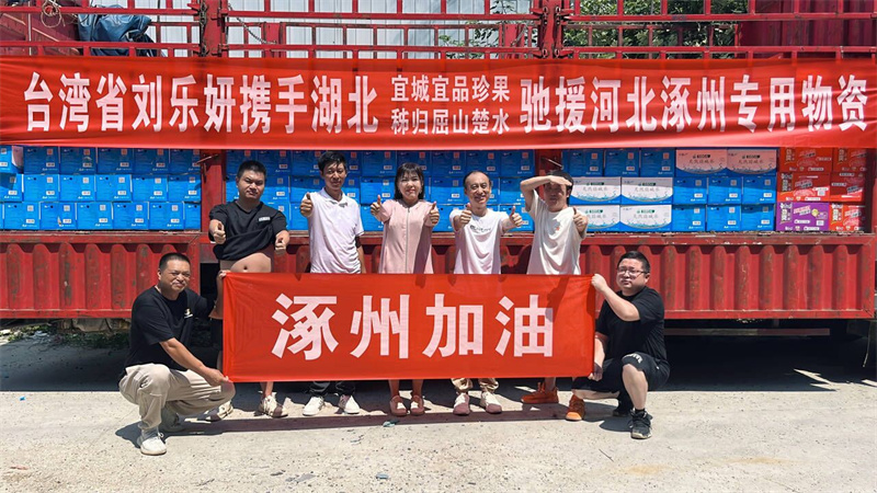近期,受臺風(fēng)“杜蘇芮”減弱低壓環(huán)流和副熱帶高壓共同影響,河北涿州等多地發(fā)生洪澇災(zāi)害,災(zāi)情牽動著無數(shù)同胞的心。從新聞上得知當(dāng)?shù)睾闈城闆r和受災(zāi)群眾急需物資的消息后,流水鎮(zhèn)落花潭宜品珍果農(nóng)業(yè)發(fā)展有限公司負(fù)責(zé)人余珍兵和正在此地直播的臺灣主播劉樂妍決定購買災(zāi)民急需物資,送到河北涿州,為災(zāi)區(qū)群眾獻(xiàn)愛心。