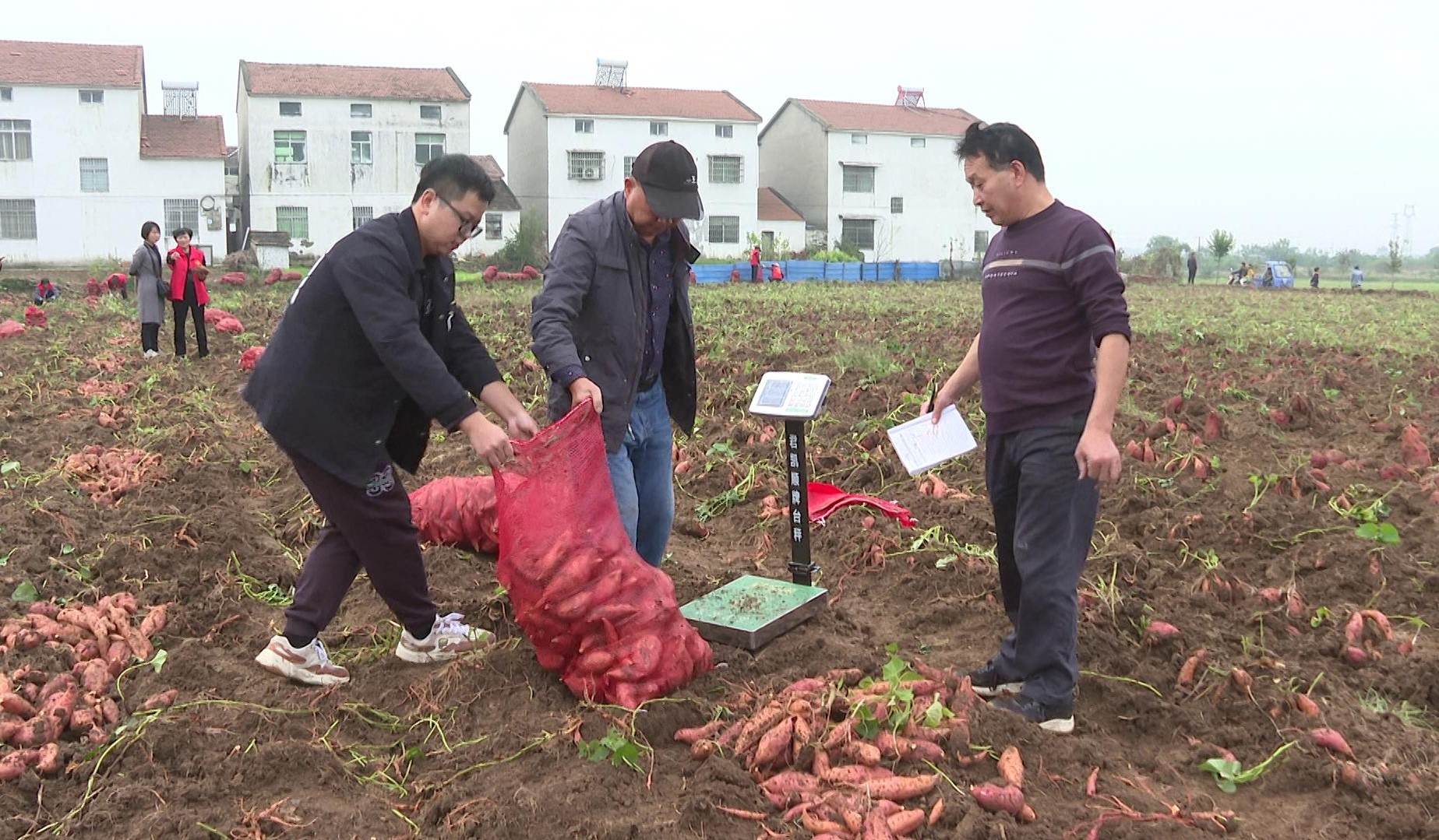 當(dāng)天一大早,隨著挖薯機(jī)在田間來回穿梭,一個個新鮮的紅薯破土而出。30多名工人分工協(xié)作,給新出土的紅薯去泥、分揀、裝袋。農(nóng)技人員忙著有條不紊稱秤、記帳……