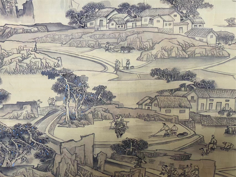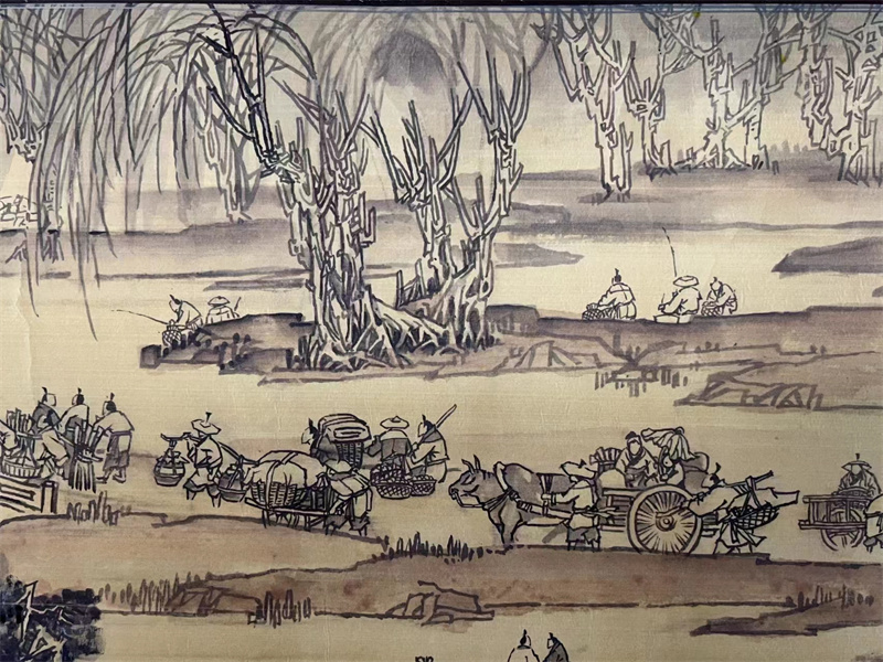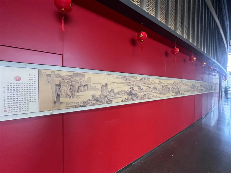 大型畫作《宜城古景攬勝圖》長13.7米、寬0.6米。主要描繪宜城的是舊八景,包括東郊柳色、西剎鐘聲、蘇湖漁唱、北壟農歌、云水秋澄、龍?zhí)洞簼q、紫蓋晴霞、赤山旭日等景色,其中還包括廣大市民比較熟悉的百里長渠、鯉魚湖、冠蓋里等景色,反映了宜城宜居宜旅宜業(yè)之城的美麗風貌。