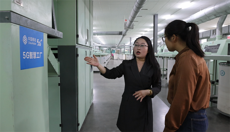 天舒紡織工作人員介紹5G智慧工廠運行情況