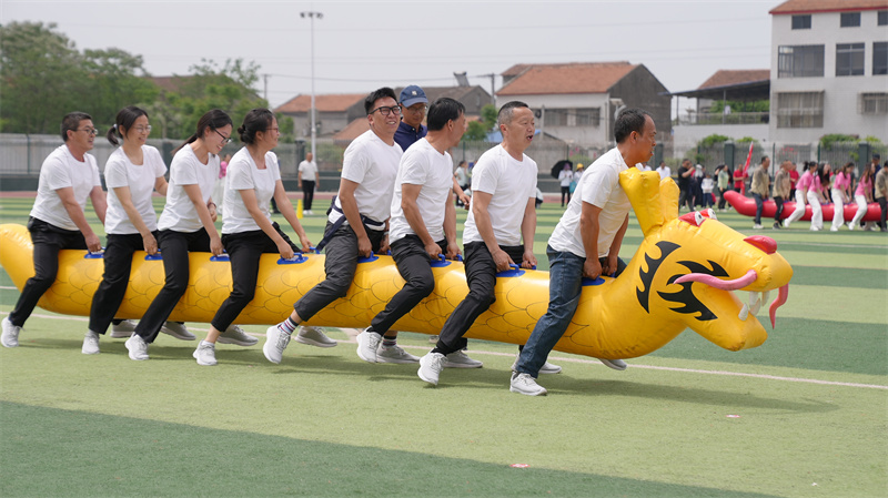 趣味運動會設(shè)置了多個極富趣味性和挑戰(zhàn)性的項目,包括第九套廣播體操、拔河、旱地龍舟、摸石頭過河、螃蟹賽跑等。廣播體操比賽中,各學(xué)校代表隊步伐整齊、動作規(guī)范、精神抖擻,充分展示了教育工作者的良好形象和團隊協(xié)作精神;拔河比賽現(xiàn)場氣氛熱烈,參賽隊員們緊握繩索,齊心協(xié)力,奮力拼搏,場邊的觀眾們也紛紛為自己支持的隊伍吶喊助威,加油聲、歡呼聲此起彼伏,將運動會的氣氛推向了高潮;旱地龍舟項目中,隊員們默契配合,步伐一致,如同真正的龍舟在賽道上飛馳;摸石頭過河、螃蟹賽跑等項目也充滿了歡聲笑語,參賽隊員們在比賽中相互幫助、相互鼓勵,展現(xiàn)了良好的團隊合作精神。