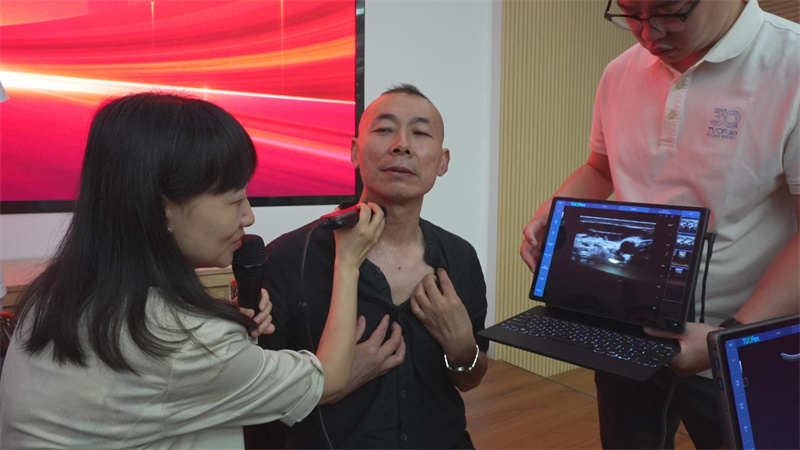 揭牌現(xiàn)場“這套系統(tǒng)就像給基層醫(yī)生裝上了‘透視眼’和‘順風(fēng)耳’,特別是對甲狀腺結(jié)節(jié)、乳腺腫塊這些‘狡猾’的部位,診斷起來更有底氣了!”襄陽市中心醫(yī)院超聲科主任王瑜形象地比喻道。她介紹,依托5G網(wǎng)絡(luò)低于0.1秒的極速響應(yīng)和纖毫畢現(xiàn)的高清畫質(zhì),遠(yuǎn)程診斷的精準(zhǔn)度得到了堅(jiān)實(shí)保障。目前服務(wù)已覆蓋腹部、婦產(chǎn)、心血管等常見項(xiàng)目,“未來,我們還將把這只‘千里眼’伸向介入超聲等更精細(xì)的領(lǐng)域,讓基層救治能力再上新臺階!被顒蝇F(xiàn)場,基層醫(yī)生的學(xué)習(xí)熱情十分高漲。襄陽市中心醫(yī)院超聲醫(yī)學(xué)科副主任秦聞被大家層層圍住,她耐心細(xì)致地手把手教學(xué),不僅將掌超操作的“獨(dú)家秘籍”傾囊相授,還把急重癥超聲診斷的“實(shí)戰(zhàn)寶典”分享給了在場的基層醫(yī)生們。