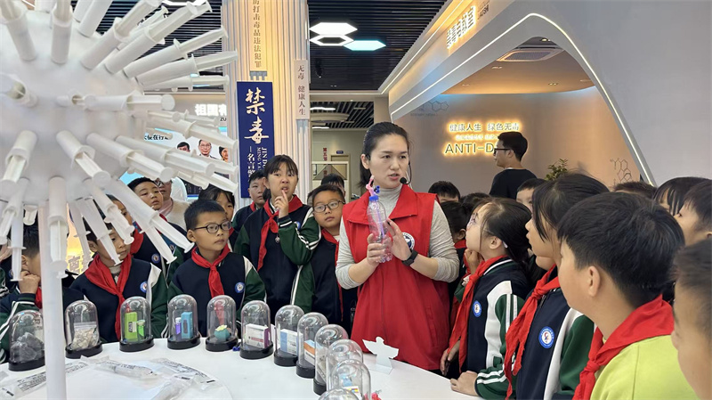 在“中國禁毒史”展區(qū),講解員講述從晚清虎門銷煙到新中國禁毒歷程的重要節(jié)點,讓學生了解中國禁毒工作的悠久歷史和堅定決心,激發(fā)孩子們的愛國情懷和禁毒責任感。