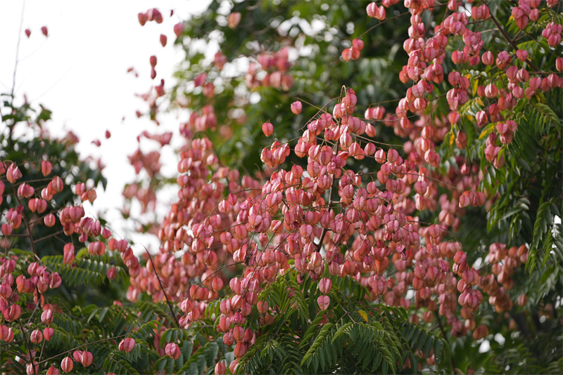 據(jù)了解,欒樹因其花果的獨特觀賞性而備受青睞。每年8至9月,它開出金黃色的圓錐花序;入秋后,其果實為蒴果,由淡青逐漸轉為粉紅乃至深紅,形態(tài)別致,因而也得名“燈籠樹”,整體觀賞期可持續(xù)數(shù)月。