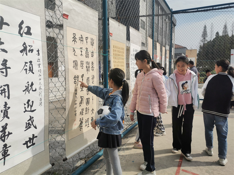 當天,近百幅內容豐富、個性鮮明、形式多樣的作品在楚才小學展出,全校師生有序進行參觀。活動現場,書畫家們還揮毫潑墨,向師生們展示書畫技藝,不一會兒,一幅幅優(yōu)秀的書畫作品呈現在師生面前。學生們圍住正在創(chuàng)作的書畫家,認真觀看筆墨運用,不時發(fā)出陣陣掌聲和驚嘆聲。