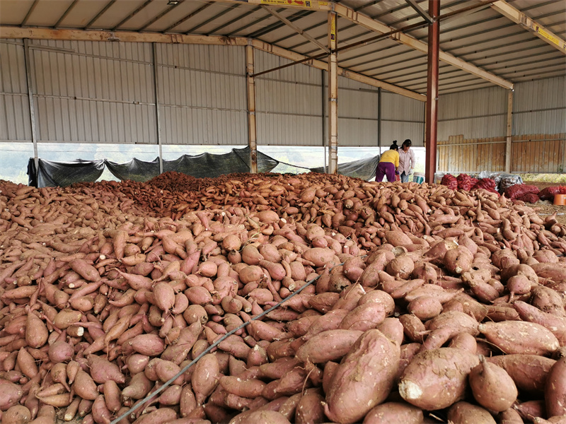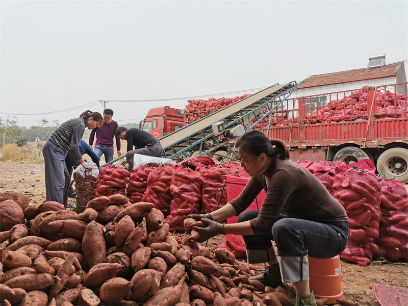 在民利家庭農(nóng)場收購點,堆滿了體態(tài)飽滿、顏色鮮亮的紅薯,工人們正忙著分揀、打包、裝車。